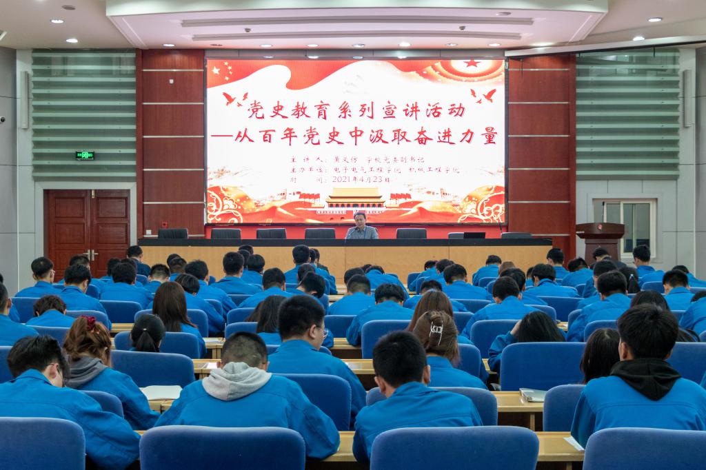 为扎实推动党史学习教育走深走实,使专题学习更加系统深入,引导广大师生党员树立良好学风,做到“学思用贯通、知信行合一”,4月23日下午,公司党史学习教育读书班在东区多媒体报告厅举行,公司党委副书记黄义仿应邀为永利官网和电子电气工程学院师生党员、入党积极分子作了题为《从百年党史中汲取奋进力量》的党史学习教育专题辅导报告。