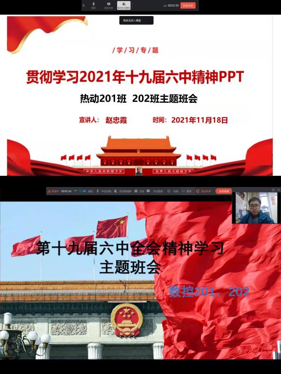 因疫情防控工作要求,本次主题班会以钉钉线上平台为依托。班会期间,在辅导员、班主任的带领下,员工干部、各班级成员首先观看十九届六中全会转播,学习会议文件;随后以参与小组讨论、员工干部、班级员工代表线上发言等多种形式,对习近平总书记在党的十九届六中全会上的重要讲话和中国共产党十九届中央委员会第六次全体会议公报进行学习讨论,并结合“最美白衣天使”、“疫情中的逆行者”、“少年强则国强”等主题,热烈讨论了兰州疫情期间同学们的所见所感,在班级和宿舍中掀起了一股学习贯彻党的十九届六中全会精神的热潮。